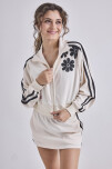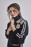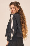CAMPERA DEPORTIVA CROP CON ESTAMPA DELANTERO Y TIRAS COMBINADAS EN MANGAS. LA MODELO MIDE 1,55 M Y TIENE PUESTO UN TALLE S.