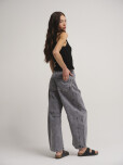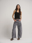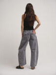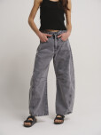 JEAN BARREL TIPO BALOON COLOR GRIS 100% ALGODÓN CON LAVADO ACID Y RECORTES LATERALES. TIRO BAJO Y RECORTE. LLEVA PINZAS EN RODILLAS Y EN TRASERO. LINEA UNISEX. LA MODELO USA UN TALLE 26 Y MIDE 1,70 MTS Y EL MODELO USA UN TALLE 32 Y MIDE 1,82 MTS.
