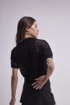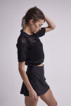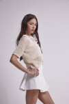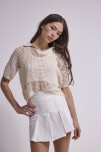 CHOMBA EN TEJIDO CALADO EN HILADO DE ALGODÓN, CON MANGA CORTA Y CUELLO TEJIDO. PERFECTO PARA UN LOOK.LA MODELO USA UN TALLE S Y MIDE 1,70 MTS.