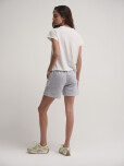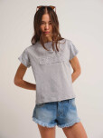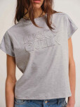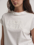 REMERA BABY TEE EN JERSEY 100% ALGODÓN CON APLIQUE EN TELA BASE EN DELANTERO Y TIRAS EN HOMBROS. LA MODELO USA UN TALLE M Y MIDE 1.70 MTS