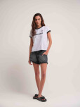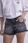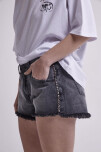 SHORT TIRO MEDIO COLOR GRIS 100% ALGODÓN, CON TIRAS DE HOTFIX EN COLOR NEGRO EN LATERALES Y BOLSILLOS FULL. RUEDO DESFLECADO. LA MODELO USA UN TALLE 26 Y MIDE 1,70 MTS