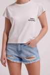 SHORT TIRO MEDIO CELESTE 100% ALGODÓN CON LAVADO DESGASTADO, ROTURAS Y RUEDO DESFLECADO. LA MODELO USA UN TALLE S Y MIDE 1,70 MTS.