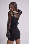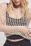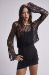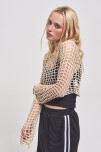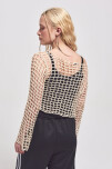 SWEATER EN TEJIDO ABIERTO TIPO RED EN HILO DE ALGODÓN Y CALCE AL CUERPO. LA MODELO USA UN TALLE M Y MIDE 1,70 MTS.