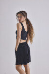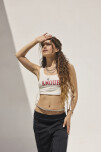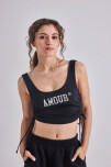TOP BÁSICO SIN MANGAS CON JARETAS LATERALES Y ESTAMPA GASTADA EN EL DELANTERO. LA MODELO MIDE 1,55 M Y TIENE PUESTO UN TALLE S.