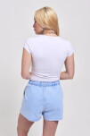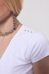 TOP CRUZADO MANGA CORTA EN ALGODÓN CON LYCRA CON ESCOTE EN V Y FRUNCES EN LATERAL. TIENE DETALLE DE TACHAS EN FORMA DE ESTRELLAS APLICADOS EN LOS HOMBROS. LA MODELO USA UN TALLE M Y MIDE 1.70 MTS