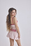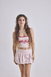 TOP BÁSICO CON BRETELES FINOS A CONTRATONO Y ESTAMPA EN EL DELANTERO. LA MODELO MIDE 1,55 M Y TIENE PUESTO UN TALLE S.