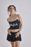 TOP BÁSICO CON BRETELES FINOS A CONTRATONO Y ESTAMPA EN EL DELANTERO. LA MODELO MIDE 1,55 M Y TIENE PUESTO UN TALLE S.
