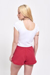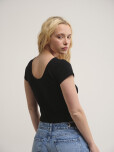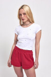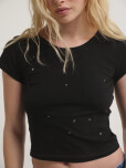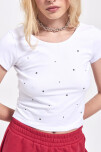TOP MANGA CORTA EN ALGODÓN CON LYCRA CON DETALLE DE HOTFIX EN EL FRENTE, QUE LE DA ESE TOQUE CUTE & COOL QUE TU LOOK ESTABA ESPERANDO. LA MODELO USA UN TALLE M Y MIDE 1.70 MTS