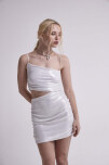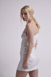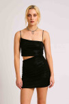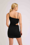 VESTIDO EN MICROFIBRA CON CORTE ASIMETRICO, BRETELES ELÁSTICOS Y CUT OUT. FRUNCES LATERALES. LA MODELO USA UN TALLE S Y MIDE 1,70 MTS.